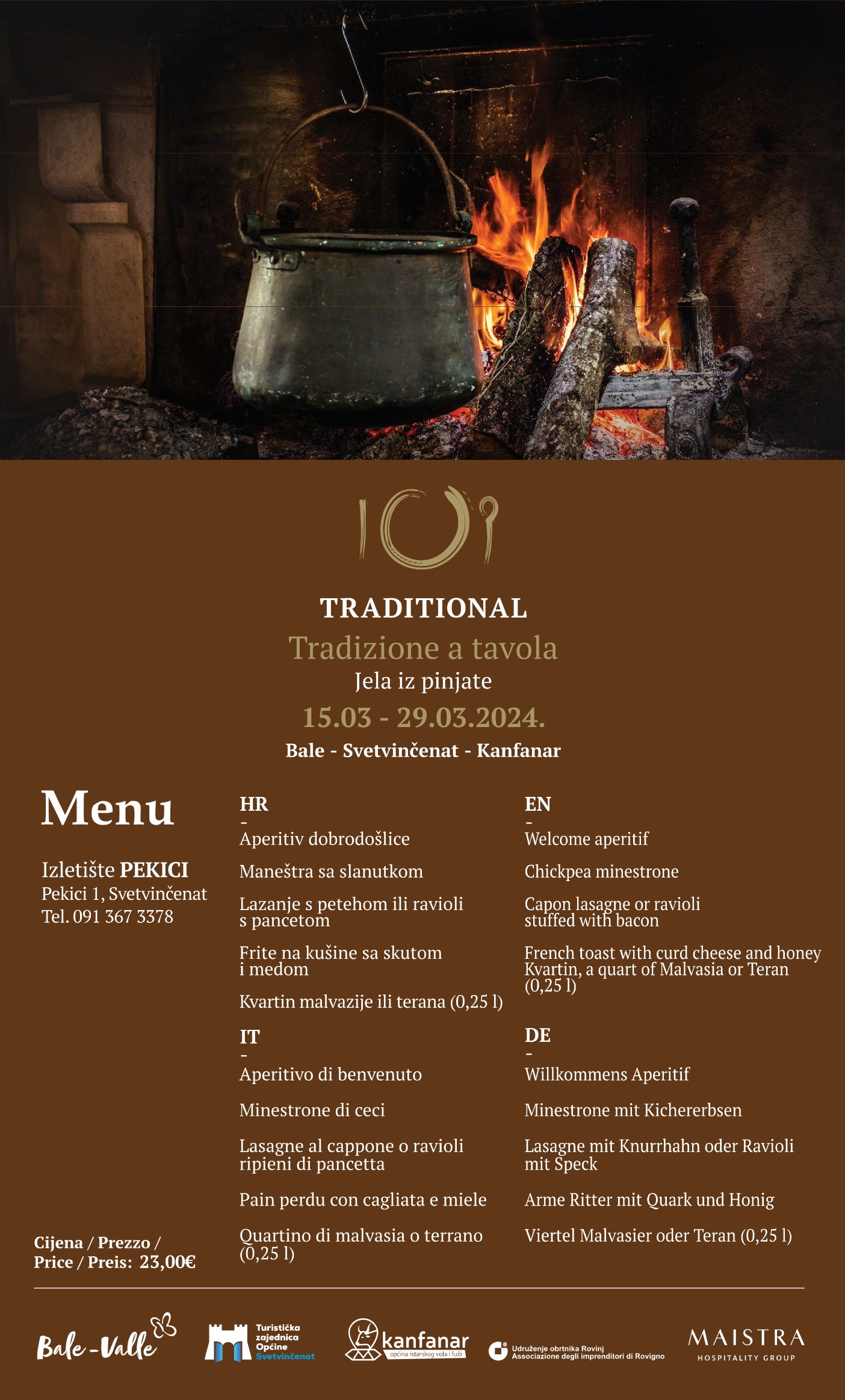 Bogata tradicija ovog kraja ponovno će uzbuditi sva vaša osjetila. Ujedno će otkriti zašto Istra iz godine u godinu postaje nezaobilazna destinacija brojnih turista. Želite li doživjeti autentičnu Istru i okusiti bogatu istarsku tradiciju, posjetite manifestaciju “Tradizione a tavola: jela iz pinjate”. Od 15. do 29. ožujka sve ljubitelje istarske kuhinje i domaćih tradicionalnih jela ponovno očekuju iznenađenja u dvorištima domaćih konoba na području Bala, Kanfanara i Svetvinčenta. Jedinstvenim i sada već dobro poznatim događajem “Tradizione a tavola: jela iz pinjate” otvorit će ovogodišnju istarsku gastronomsku sezonu. Posjetitelji će imati priliku kušati brojna autohtona istarska jela pripremljena na tradicionalne načine.